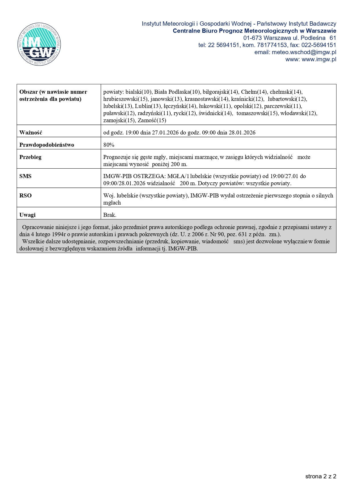 Jesteś tutaj: Start>Ogłoszenia>PROGNOZA NIEBEZPIECZNYCH ZJAWISK METEOROLOGICZNYCH 27-28.01.2026 r.