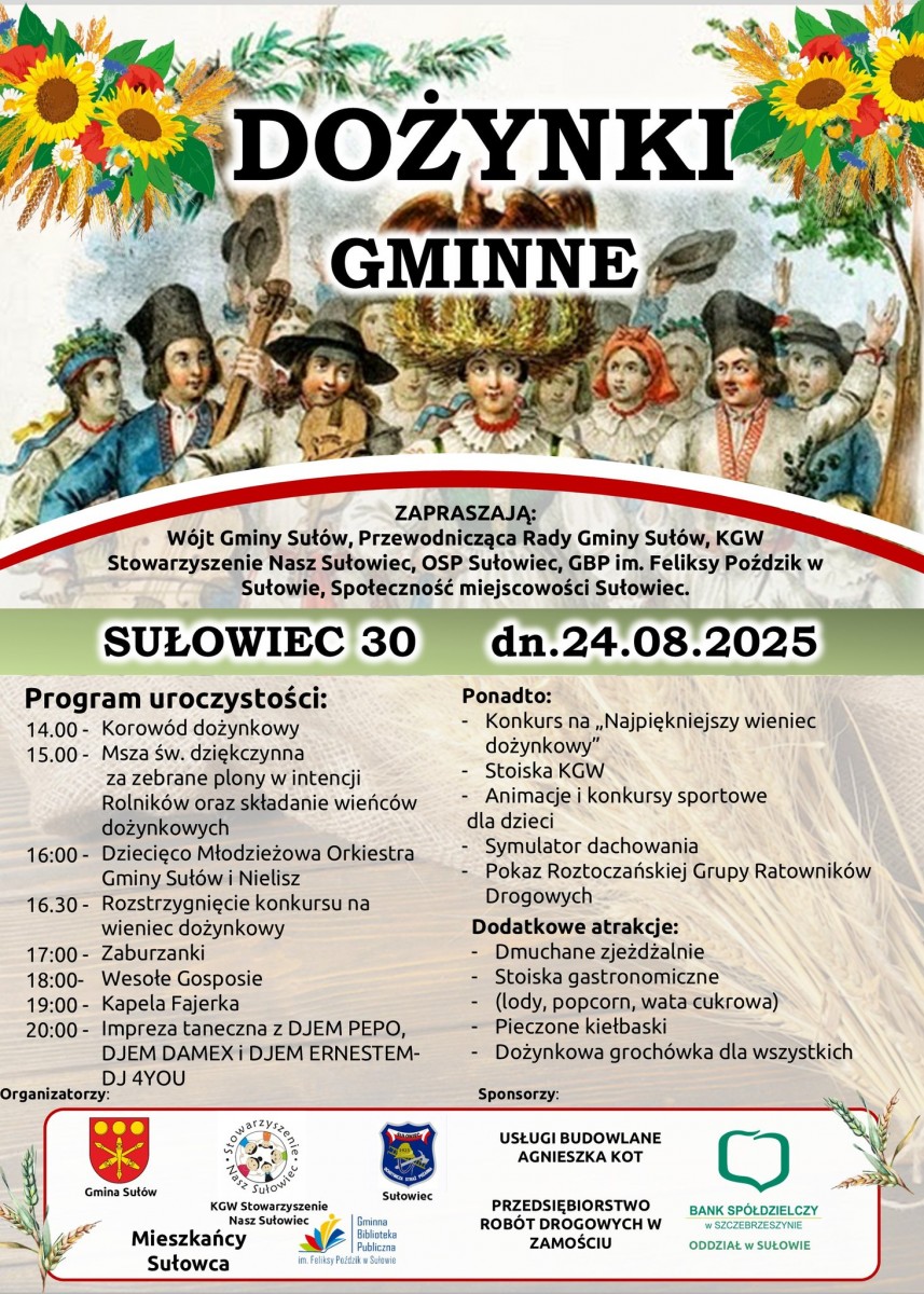 24 sierpnia 2025 roku w Sułowcu spotkaliśmy się, aby wspólnie podziękować za tegoroczne plony i uczcić trud pracy naszych rolników. Dzień rozpoczął się barwnym korowodem dożynkowym, w którym każda wieś niosła swoje dary – wieńce, chleby i kosze pełne owoców ziemi.